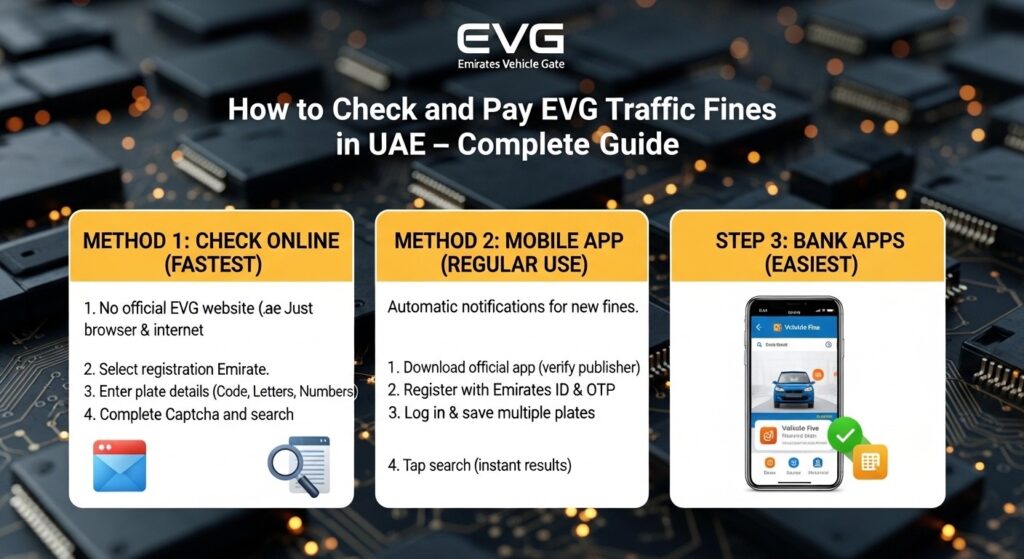 Traffic fines in the UAE. Nobody likes them. But ignoring them? That makes things worse. EVG stands for Emirates Vehicle Gate. It is the system behind most traffic fines outside Dubai and Abu Dhabi. Sharjah. Ajman. RAK. Fujairah. Umm Al Quwain. All use EVG. The problem? Many drivers have no clue how to check or pay. So here is the deal. Learn the right way. Skip the confusion. Skip the long queues. This guide gives straight answers. Online method. Mobile app. Bank apps. In-person. No fluff. No stories. Just steps that work.