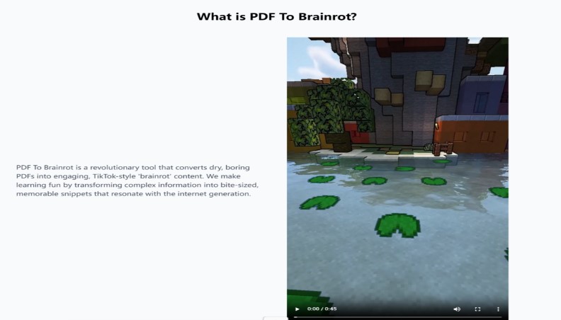 At a functional level, Pdf to Brainrot takes content (PDF and other sources) and turns it into a short, watchable learning video that typically includes: